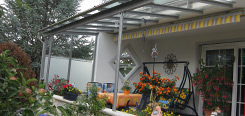 Überdachungen ganz individuell der Terrasse angepasst. Transparent durch große Glasflächen. Verschattungen mit Unterglasmarkisen.