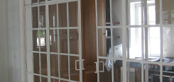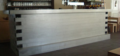 Tresen gefertigt aus Aluminium-Hohlprofilen und mit Klarsichtfolie versiegelt. Türrahmenblende.