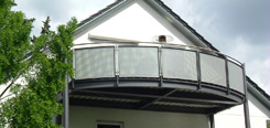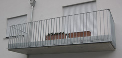 Stahlbalkongeländer, feuerverzinkt, z.T. in RAL Farben pulverbeschichtet mit verschiedenen Füllungen (Glas, Aluminiumlochbleche oder Trespaplatten).